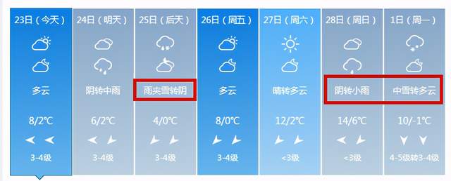23日夜间到24日白天,多云转阴,西部地区有小雨,东北风4级阵风6~7级,气温2~6℃;