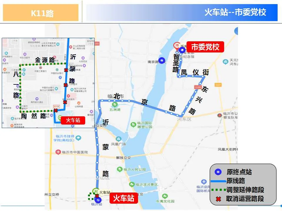 K11路由火车站运行至市委党校,线路主要途经沂蒙路、北京东路、东兴路、凤仪街。调整后线路起讫点不变,取消沂蒙路(金源路—陶然路)段运营,调整至金源路、八一路、陶然路路段运营,增加停靠站点2处:兰山工行家属院、陶然居西。