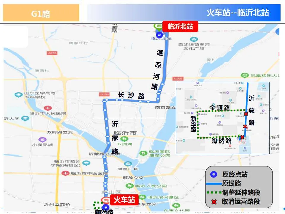 G1路由火车站运行至临沂北站,线路主要途经陶然路、沂蒙路、长沙路、温凉河路、雄安路、汤河路。调整后线路起讫点不变,取消沂蒙路(金源路—陶然路)段的运营,调整至金源路、新华路、陶然路运营,增加停靠站点4处:兰山工行家属院、盛世华庭、付屯、陶然客运换乘中心。