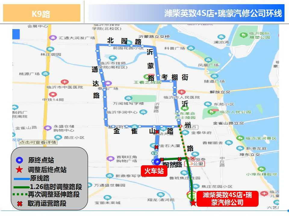 K9路原为火车站环线,于2021年1月26日临时调整,调整后线路终点站由火车站调整为潍柴英致4S店·瑞蒙汽修公司。线路主要途经沂蒙路、金雀山路、沂州路、北园路、通达路。再次调整后线路将取消沂蒙路(金雀山路—陶然路)、陶然路(沂蒙路—沂州路)段运营,调整至沂州路(金雀山路—陶然路)段运营。取消停靠站点5处:金雀山路站台、金坛路站台、火车站、火车站东、沂州路路口(陶然路),增加停靠站点4处:齐鲁市场、金雀山办事处、御园金顶东门、联安现代城。