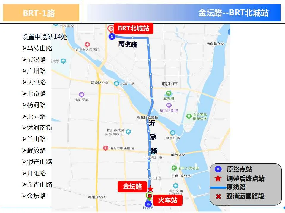 BRT-1路由火车站运行至BRT北城站,线路主要途经陶然路、沂蒙路、南京路。调整后线路将取消沂蒙路(金源路—陶然路)段的运营,调整至沂蒙路与金源路路口调头往返,线路由金坛路运行至BRT北城站,取消停靠站点1处:火车站。
