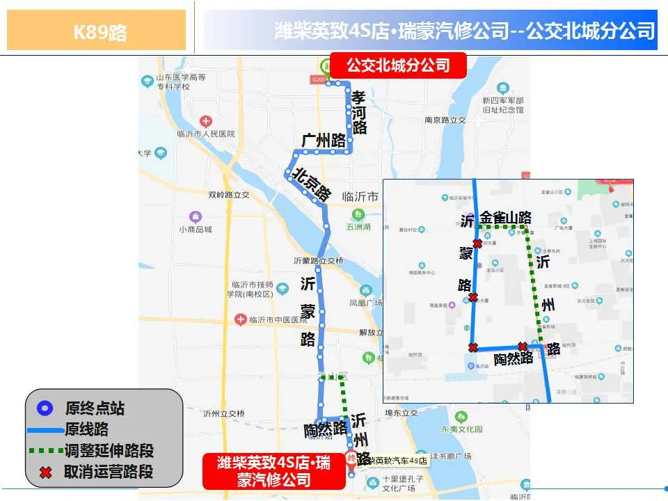 K89路由潍柴英致4S店·瑞蒙汽修公司运行至公交北城分公司。线路主要途经沂州路、陶然路、沂蒙路、北京路、马陵山路、广州路、孝河路、南昌路。调整后线路起讫点不变,取消沂蒙路(金雀山路—陶然路)、陶然路(沂蒙路—沂州路)段运营,调整至金雀山路、沂州路运营,取消停靠站点4处:金雀山路站台、金坛路站台、火车站东、沂州路路口,增加停靠站点6处:移动大厦、兰山区政府、齐鲁市场、金雀山办事处、御园金顶东门、联安现代城。