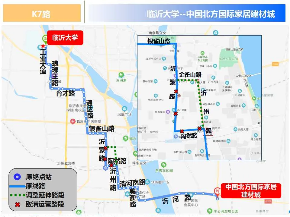 K7路由临沂大学运行中国北方国际家居建材城,线路主要途经工业大道、双岭路、琅琊王路、育才路、通达路、银雀山路、沂蒙路、陶然路、沂州路、清河南路、美澳路、沂河路。调整后线路起讫点不变,取消沂蒙路(金雀山路—陶然路)、陶然路(沂蒙路—沂州路)段的运营,临时调整至金雀山路、沂州路路段运营,取消停靠站点4处:金雀山路站台、金坛路站台、火车站东、沂州路路口,增加停靠站点6处:移动大厦、兰山区政府、齐鲁市场、金雀山办事处、御园金顶东门、联安现代城。