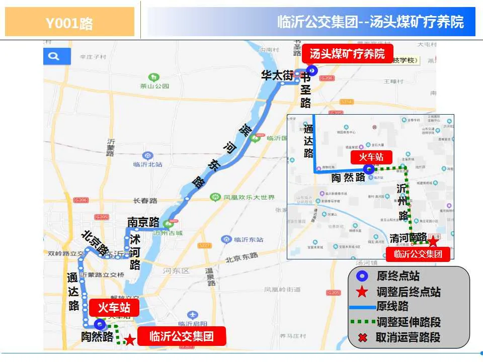 Y001路由火车站运行至汤头煤矿疗养院,线路途经通达路、北京路、沭河路、南京路、滨河东路、华太街、书圣路。调整后原线路保持不变,并将线路延长至临沂公交集团,途经陶然路、沂州路、清河南路,增加停靠站点7处:火车站东、沂州路路口(陶然路)、清泉小区、焦庄、临沂市食药检中心、怡景绿洲、临沂公交集团。