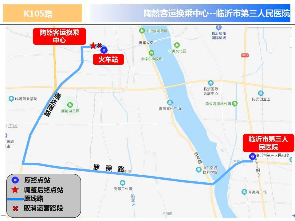 K105路由火车站运行至临沂市第三人民医院,线路途经陶然路、通达南路、罗程路、华夏路。调整后线路将取消陶然路(火车站—陶然客运换乘中心)段的运营,调整后线路由陶然客运换乘中心运行至临沂市第三人民医院,取消停靠站点1处:火车站。