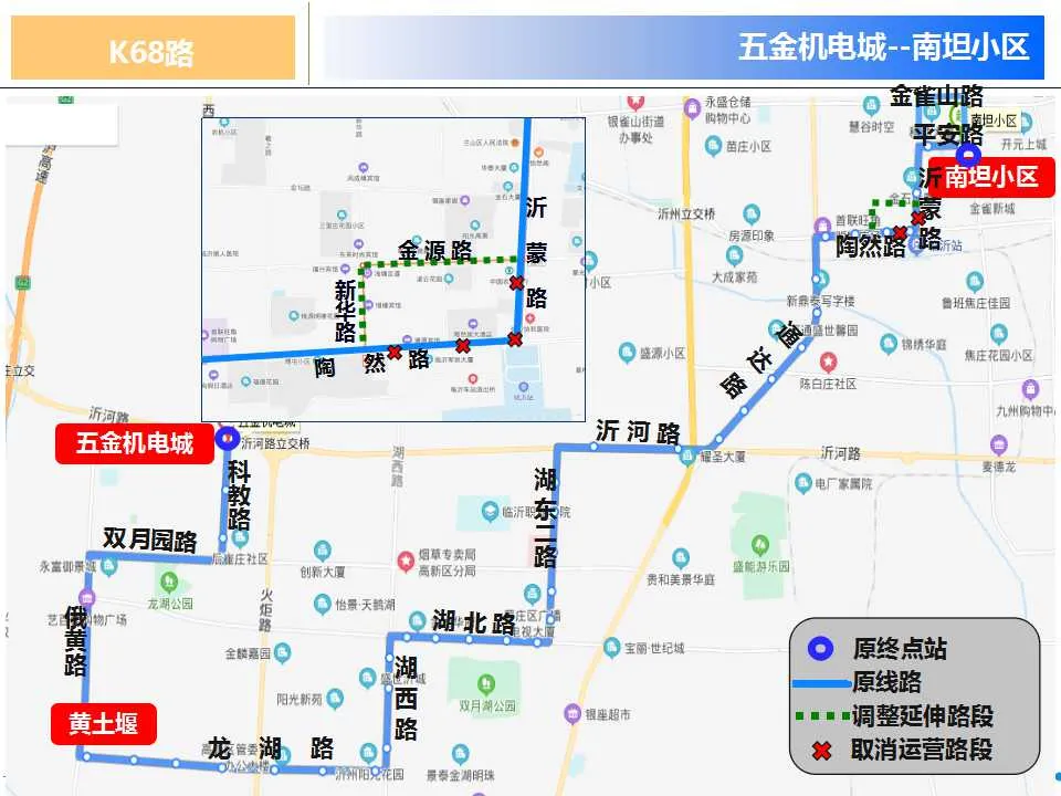K68路由南坦小区运行至五金机电城,线路主要途经平安路、沂蒙路、陶然路、通达路、沂河路、湖东二路、湖北路、湖西路、龙湖路、俄黄路、双月园路、科教路。调整后线路起讫点不变,取消沂蒙路(金源路—陶然路)段的运营,调整至金源路、新华路、陶然路后恢复原线路运营,取消停靠站点2处:火车站(陶然路)、陶然客运换乘中心,增加停靠站点3处:兰山工行家属院、盛世华庭、付屯。
