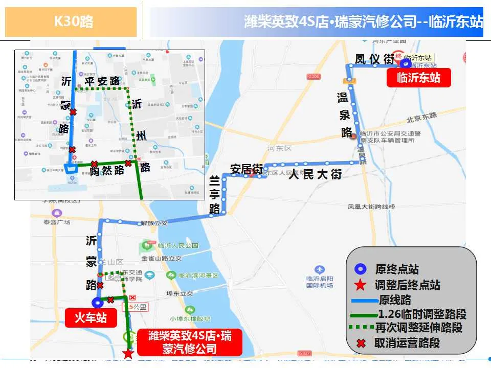 K30路于2021年1月26日临时调整,调整后线路由潍柴英致4S店·瑞蒙汽修公司运行至临沂东站。线路主要途经沂州路、陶然路、沂蒙路、解放路、兰亭路、正阳路、人民大街、温泉路、凤仪街。再次调整后线路起讫点不变,取消沂蒙路(平安路—陶然路)、陶然路(沂蒙路—沂州路)段运营,调整至平安路、沂州路运营,取消停靠站点4处:金坛路站台、火车站、火车站东、沂州路路口,增加停靠站台5处:工商银行、南坦小区、金雀山办事处、御园金顶东门、联安现代城。