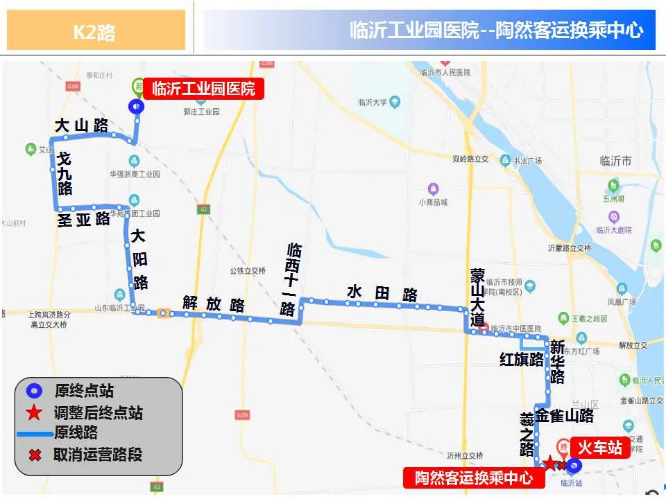 K2路由临沂工业园医院运行至火车站,线路途经大山路、戈九路、圣亚路、大阳路、解放路、临西十一路、水田路、蒙山大道、红旗路、新华路、金雀山路、羲之路、陶然路。调整后线路将取消陶然路(陶然客运换乘中心—火车站)段的运营,调整后线路由临沂工业园医院运行至陶然客运换乘中心,取消停靠站点1处:火车站。