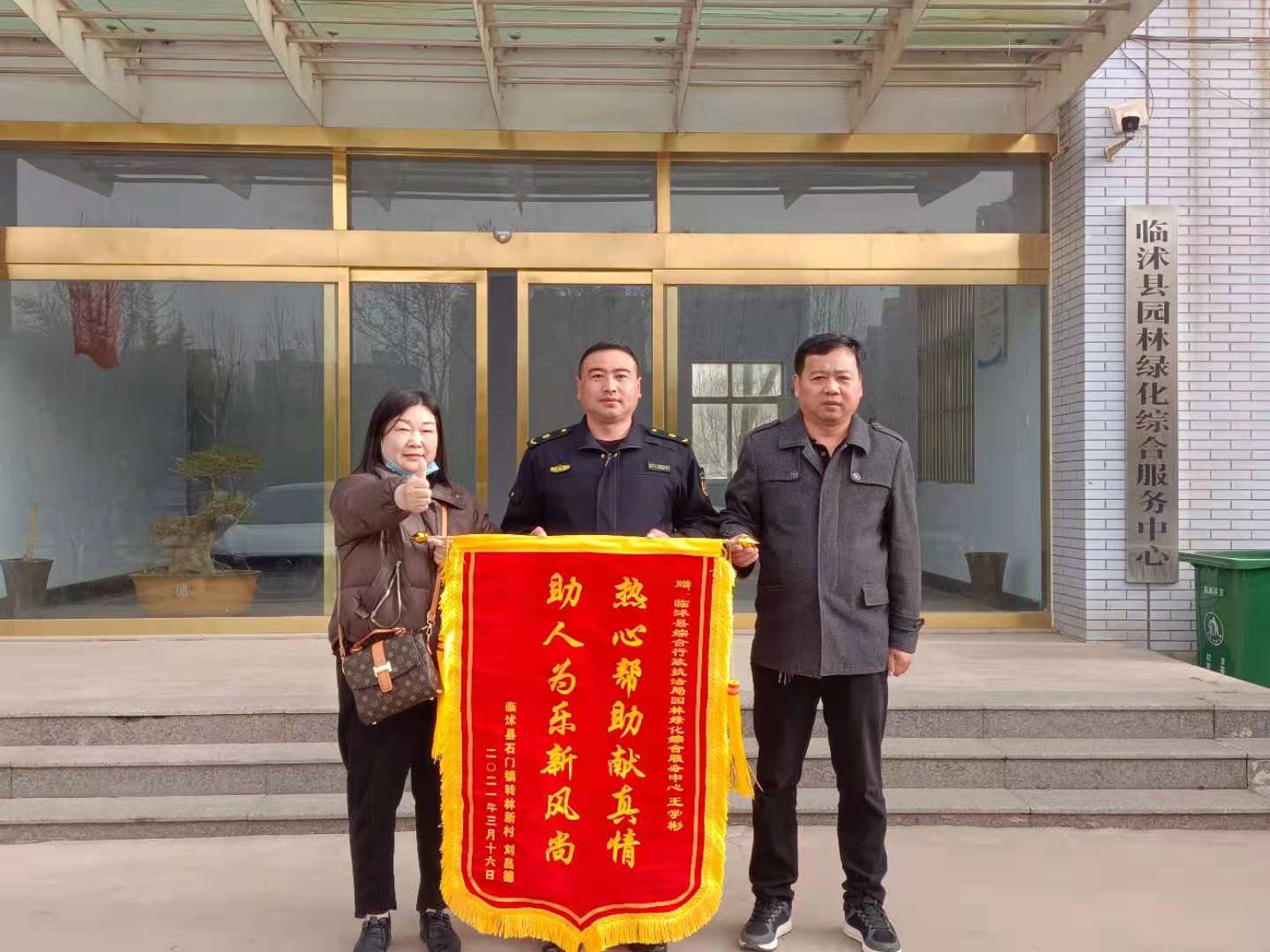 临沂在线讯(刘莲 通讯员 石敬山 李宝阔 曹锦呈)“谢谢您们,多亏了您们这些好心的城管同志帮助,如果不是你们热心帮忙把走失多日的老人送回到家中,我们还不知什么时间才能找到他,真是太麻烦您们了。”3月16日上午,家住临沭县河东岸小区的陈女士来专程赶到临沭县综合行政执法局园林绿化综合服务管理中心,将一面写有“热心帮助献真情、助人为乐新风尚”的锦旗,送至园林督查科王学彬的手中,感谢他热心相助将其走失多日的公爹找到并安全送回家中。
