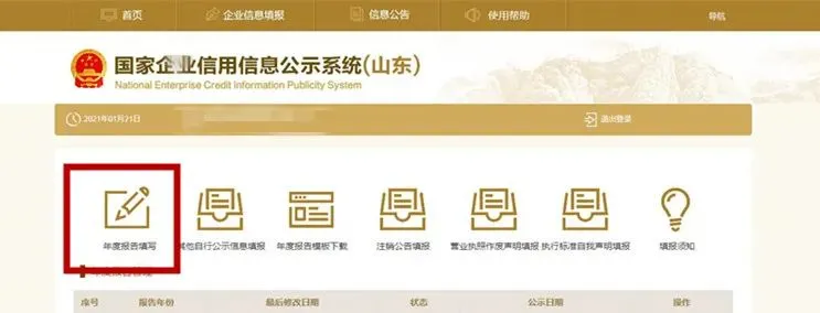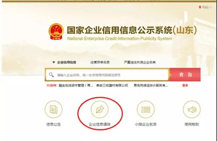 进入国家企业信用信息公示系统(山东)首页,点击“企业信息填报”图标。