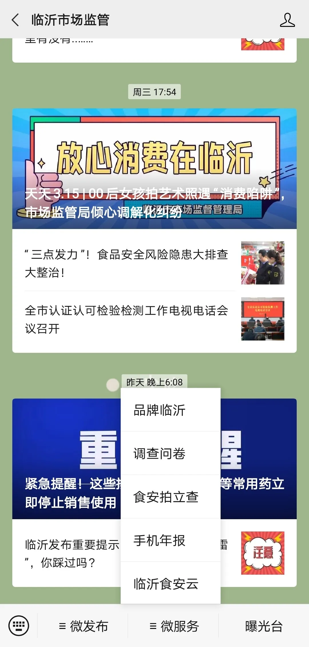 1、关注“临沂市场监管”微信公众号,点击菜单栏“微服务—手机年报”。