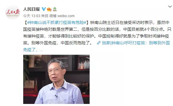 钟南山院士近日在接受采访时表示,虽然中国疫苗接种绝对数是世界第二,但是按百分比数的话,中国目前就4个百分点。只有接种疫苗,才能够得到比较好的保护。中国控制得好就是为了争取时间接种疫苗。别等外国免疫,中国反而危险了。