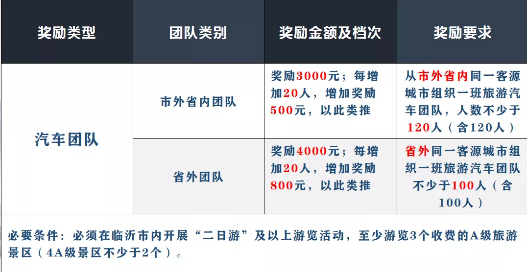 从2009年起,临沂市连续十多年出台奖励办法,拿出专项资金奖励招徕游客的地接社和输送游客的组团社,以拉动旅游业的快速增长。较往年奖励办法,根据旅游市场形势新变化,今年临沂出台的奖励政策进一步放宽了奖励范围、降低了奖励门槛,新增了对红色研学团队、自驾游团队和高铁旅游团队的奖励,2021年临沂市奖励总额度达200万元。县区出台的奖励办法也纷纷提升了奖励额度、丰富了奖励类型,并加大了对自驾游团队等项目的奖励。