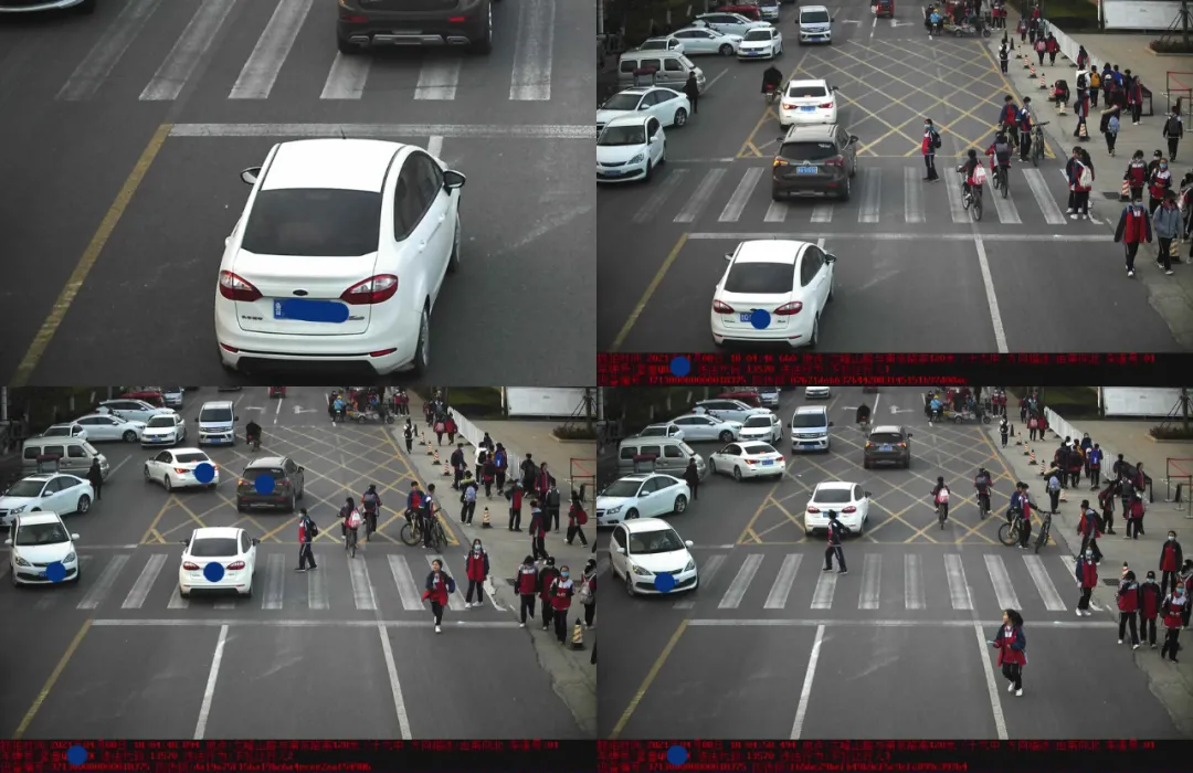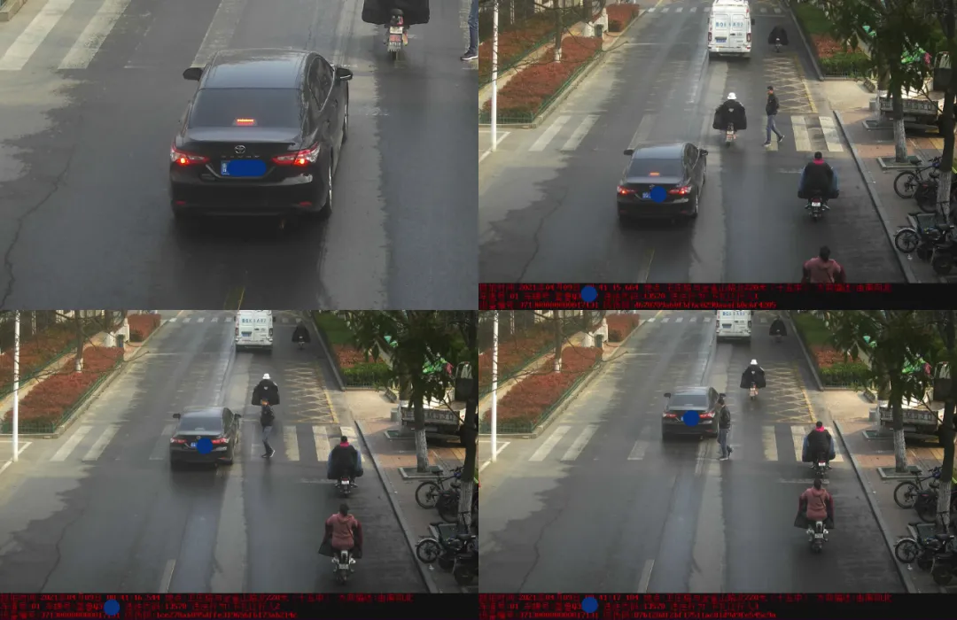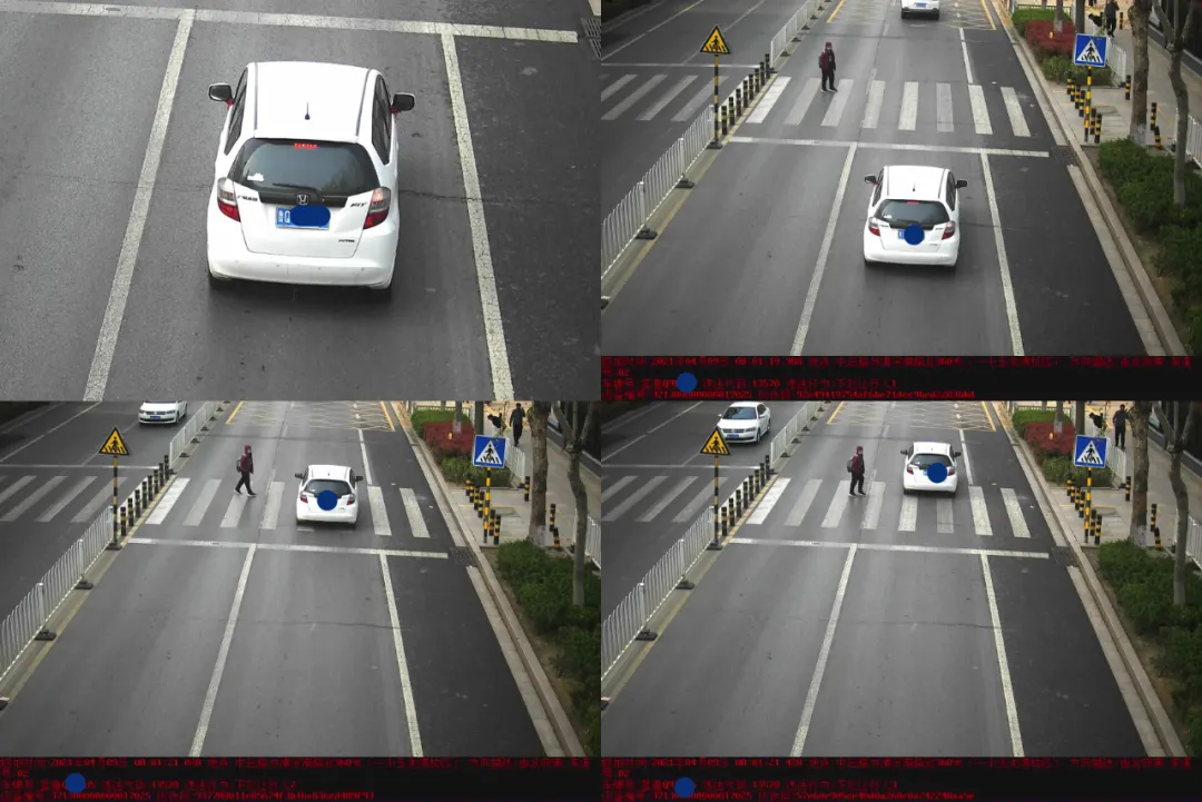 当道路两侧有绿化带,行人走斑马线还未穿过绿化带时,紧贴绿化带车道的车辆需要停车让行;当行人走斑马线已穿过绿化带时,所有车道的车辆都必须停车让行。