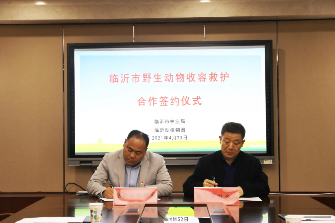 期间,临沂市林业局与临沂动植物园举行了临沂市野生动物收容救护合作签约仪式。 临沂市野生动物救护站于2013年成立并落户临沂动植物园,是我省第一家市级野生动物救护站,该站自成立以来依托临沂动植物园雄厚的动物医疗救助水平,近年来接到群众拨打野生动物救护电话640多个,出动车辆610余台次,行程36800多公里,累计救护各类野生动物近4000头只,其中包括一级保护动物有金雕、东方白鹳、丹顶鹤、白鹤等10余种、140余只,二级保护动物如猕猴、娃娃鱼、白鹭、天鹅等30余种,500余只,另外救助低危物种如画眉、百灵等30余种、近3000余只。该站目前配备八名专业兽医师,其中中级兽医师一名,国家执业兽医师一名,兽医师六名,主要负责救助站的动物救护工作及各种动物医疗工作,包括野生动物救助、化验、护理、手术治疗等。并于2020年与枣庄市森林公安签约承担枣庄地区野生动物收容救护工作。