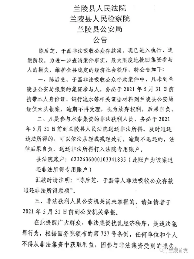 一、陈后芝、于磊非法吸收公众存款案件中,凡未到兰陵县公安局报案的集资参与人,务必于2021年5月31日前携带本人身份证、银行流水等相关证据材料到兰陵县公安局经侦大队报案,逾期不再受理,视为放弃权利,后果自负。