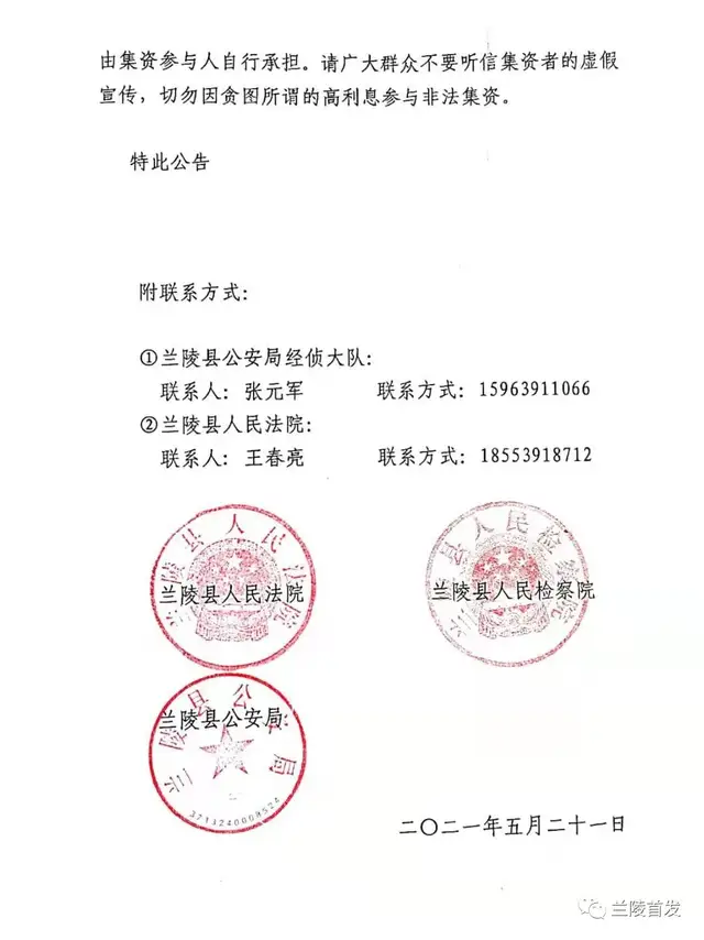 二、凡是参与本案集资的非法获利人员,务必于2021年5月31日前到兰陵县人民法院退还非法所得。及时退还违法所得的,可以依法从轻或减轻处罚。逾期不退还的,法律后果自负。退还非法所得打入法院专用账户。