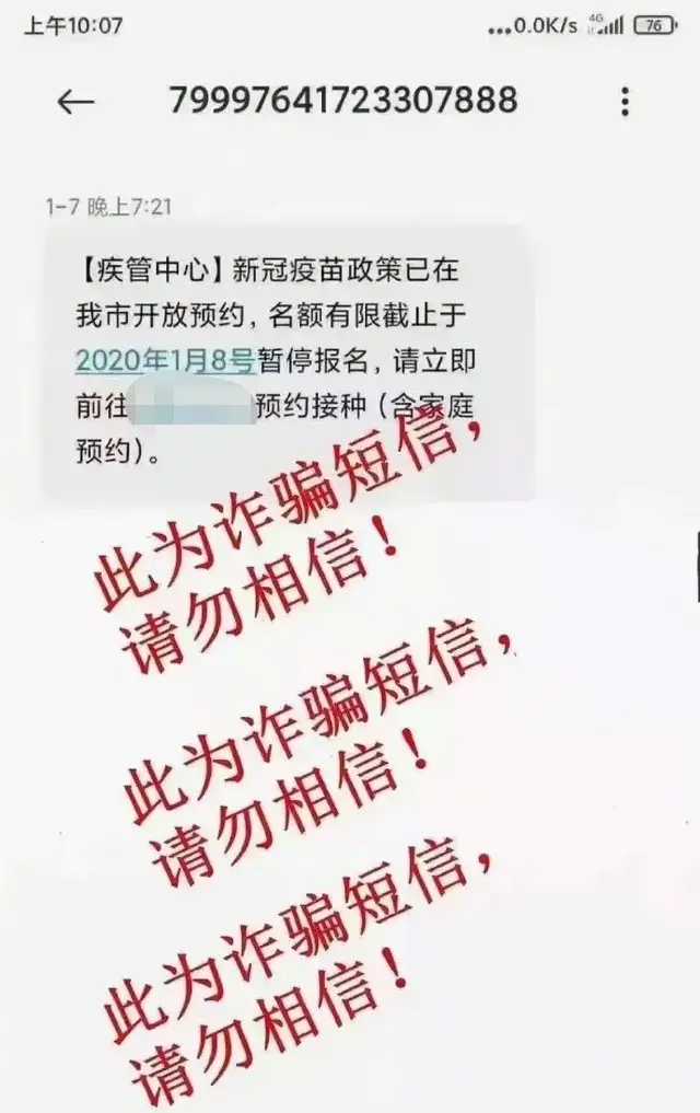 骗子冒充疾控中心散发“交费接种新冠疫苗”的短信,其中包含引诱性链接,也是就钓鱼网站,一旦点击,切勿输入个人信息、银行卡号、密码及手机验证码。