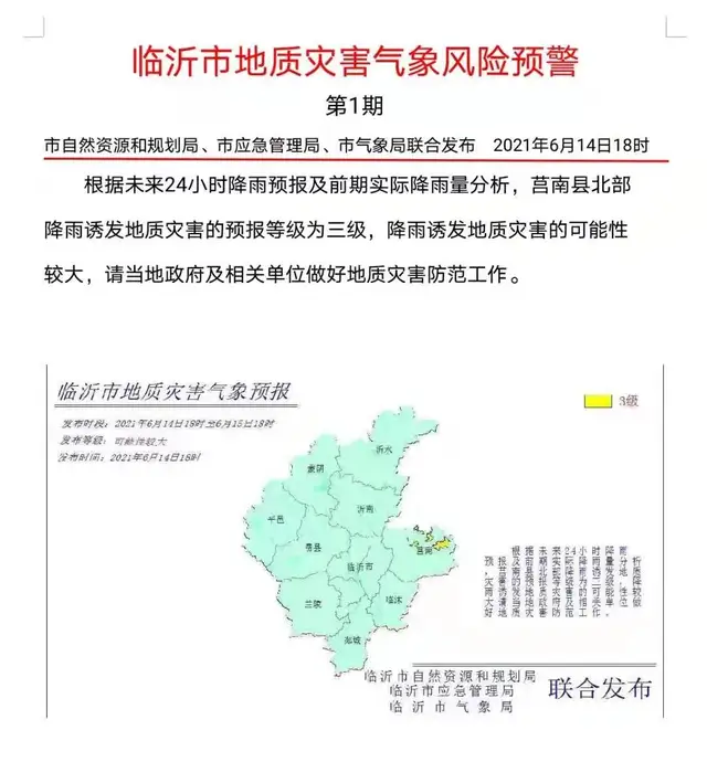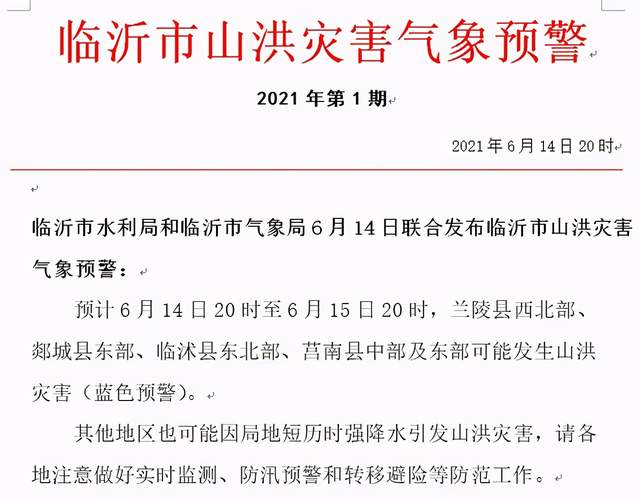 临沂市水利局和临沂市气象局6月14日联合发布临沂市山洪灾害气象预警: