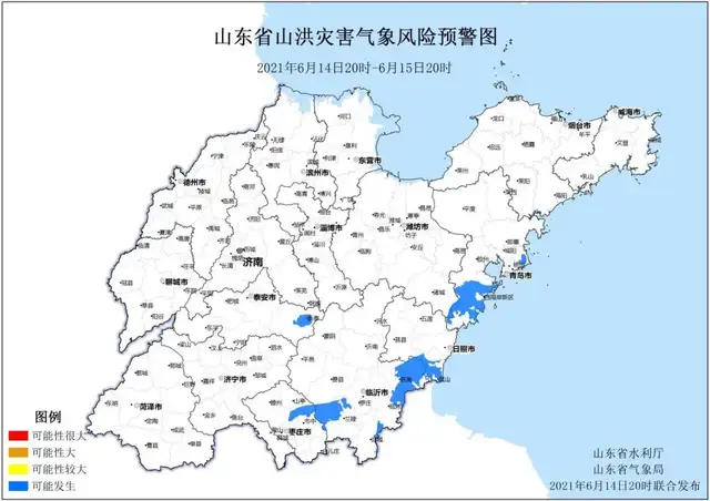 预计6月14日20时至6月15日20时,泰安、枣庄、临沂、日照、青岛等市局部地区可能发生山洪灾害(蓝色预警)。包括:新泰市中部、山亭区南部、兰陵县西北部、郯城县东部、临沭县东北部、莒南县中部及东部、岚山区西部及南部、西海岸新区大部、崂山区中部。