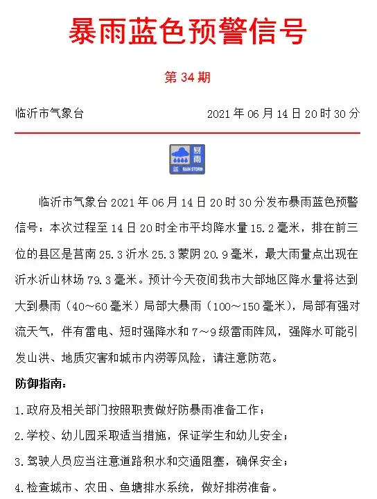 山东省气象局于6月14日18时30分发布暴雨蓝色预警信号:预计今天夜间,菏泽的东部和济宁、枣庄、临沂、日照有大到暴雨(40~60毫米),局部大暴雨(100~150毫米)。根据《临沂城防汛应急预案》(临城汛字(2020)1号)有关要求,市城市防指决定于2021年6月14日19时40分发布城市防汛级预警。