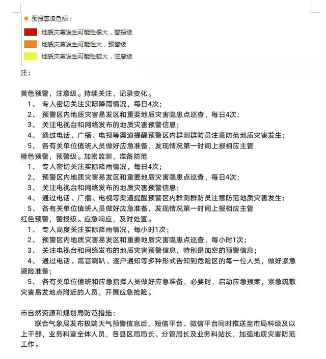 请各级各部门按照预案规定和职责分工,迅速落实城市防汛 IV级预警行动措施,加强值班值守和重点部位巡查,做好启动城市防汛IV级响应的有关准备,全力高效应对本轮降雨。遇有重大汛情险情灾情及时上报市城市防汛抗旱指挥部办公室。
