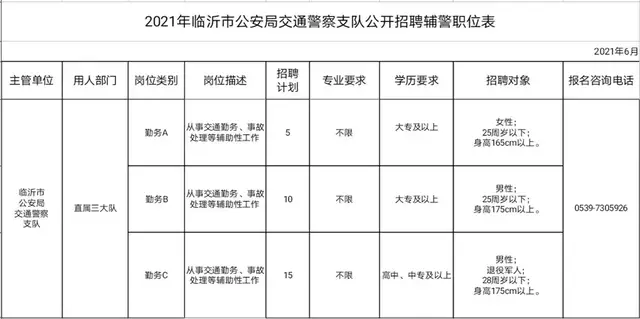 附件:1.《2021年临沂市公安局交通警察支队公开招聘辅警职位表》