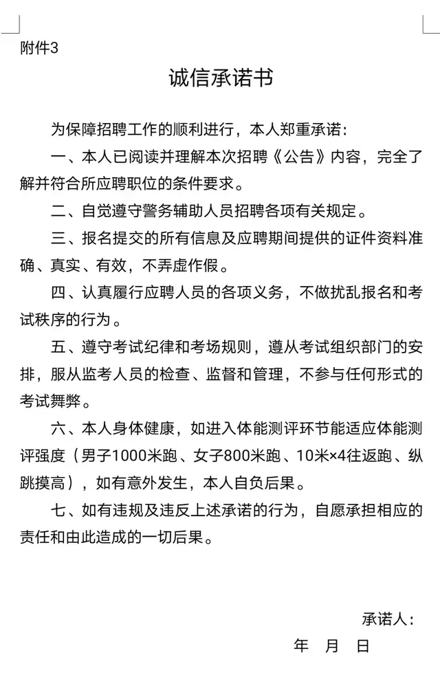 4、资格审查。报名须本人到场,工作人员依据招聘条件对应聘者进行现场资格审查,审查合格的准予参加笔试,并当场签定《诚信承诺书》(附件3)。