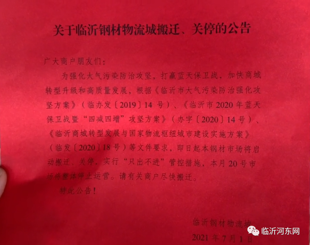 关于临沂钢材物流城搬迁、关停的公告