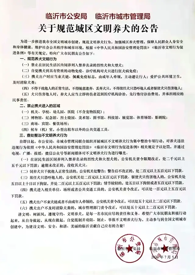 为进一步推进我市全国文明城市创建,规范文明养犬行为,加强城区养犬管理,保障人民群众人身安全和身体健康,维护社会公共秩序和城市环境,根据《中华人民共和国治安管理处罚法》《临沂市文明行为促进条例》等有关规定,特向广大市民朋友公告如下:
