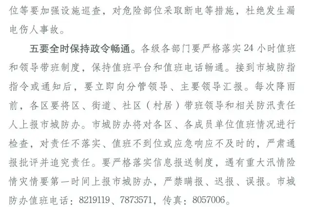 1.各级各部门要迅速进入临战状态,立即上岗到位,狠抓措施落实。辖区内所有防汛行政责任人、技术责任人、巡查责任人要全部在岗到位,全面掌握负责范围内的防汛工作,认真履职尽责。严格落实领导带班和联合值班值守制度,确保信息畅通、调度及时。要及时、规范、准确、全面上报信息,坚决杜绝瞒报、漏报、迟报、错报。