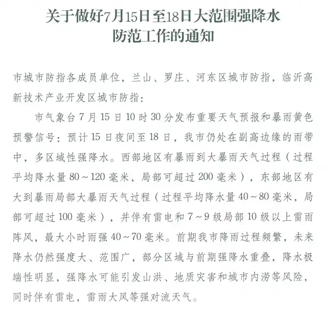 2021年7月15日10时30分,临沂市气象台发布暴雨黄色预警信号:预计15日夜间至18日,我市仍处在副高边缘的雨带中,多区域性强降水。西部地区有暴雨到大暴雨天气过程(过程平均降水量80~120毫米,局部可超过200毫米),东部地区有大到暴雨局部大暴雨天气过程(过程平均降水量40~80毫米,局部可超过100毫米),并伴有雷电和7~9级局部10级以上雷雨阵风,最大小时雨强40~70毫米。前期我市降雨过程频繁,未来降水仍然强度大、范围广,部分区域与前期强降水重叠,降水极端性明显,强降水可能引发引发山洪、地质灾害和城市内涝等风险,同时伴有雷电,雷雨大风等强对流天气。