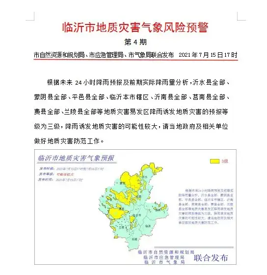 根据未来24小时降雨预报及前期实际降雨量分析,沂水县全部、蒙阴县全部、平邑县全部、临沂本市辖区、沂南县全部、莒南县全部、费县全部、兰陵县全部等地质灾害易发区降雨诱发地质灾害的预报等级为三级,降雨诱发地质灾害的可能性较大,请当地政府及相关单位做好地质灾害防范工作。