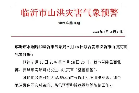 预计7月15日20时至7月16日20时,我市兰陵县西北部、费县东南部可能发生山洪灾害(蓝色预警)。其他地区也可能因局地短历时强降水引发山洪灾害,请各地注意做好实时监测、防汛预警和转移避险等防范工作。