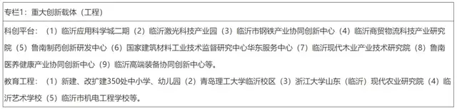 交通:(1)京沪高铁辅助通道临沂段(2)济莱临连高速铁路(3)临沂至枣庄至徐州城际铁路(4)鲁中高铁临沂段(5)临沂至连云港普通铁路临沭至连云港段(6)临朐至沂水铁路(7)山东如通铁路货运专用线(8)临沂宝道铁路物流专用线(9)兰陵县金石建设铁路专用线(10)山钢临港铁路物流园支线永锋专用线(11)临沂山东港汇国际物流铁路专用线(12)山东清沂山石化铁路专用线(13)临沂东城铁路物流项目(14)临沂临港疏港铁路(15)临淄至临沂高速公路(16)临沂至滕州高速公路(17)临沂至东海高速公路(18)临沂至徐州高速公路(19)董梁高速公路(20)蒙阴至邳州高速公路(21)G518日定线临沂日照界至长深高速临沂东互通立交段改建工程(22)临沂启阳机场航站楼改扩建及附属工程(23)费县通用机场(24)临沭蛟龙通用机场(25)陶沟河复航工程(26)临沂火车站客运设施改造项目(27)高铁北站交通综合体(28)兰陵-邳州港疏港公路等。 能源:(1)烟威电源基地1000kV配套送出工程(泉城-微山湖1000kV过境线路)(2)临沂各类500kV及以下电网基建工程(3)中俄东线天然气管道(临沂段)(4)山东环网天然气管道南干线及东干线(临沂段)(5)山东沂蒙抽水蓄能电站(6)中石化油库搬迁和油库所属管道改造升级(7)LNG调峰储备中心等。 水利:(1)黄山水库(2)中心城区水系连通工程(3)沭河和分沂入沭水道综合治理工程(4)沂蒙山区河湖水系治理工程(5)双堠水库(6)临沂市大中型水库增容工程(7)祊河左岸堤防工程(8)刘家道口灌区工程(9)沂沭河雨洪资源利用工程(10)邳苍分洪道提标工程(11)东汶河和蒙河综合治理工程(12)跋山水库、沙沟水库向临沂城区及周边县区供水工程(13)高铁片区水系工程(14)临港高端不锈钢与先进特钢基地供水工程(15)水利信息化建设项目等。 市政:(1)临沂市城市轨道交通(2)滨河大道提升改造工程(3)沂河路快速化改造(4)陶然路快速路建设工程(5)沂蒙路北段快速化改造工程(6)温泉路快速化改造(7)南京路快速化改造(8)启阳机场快速进出通道工程(9)通达路祊河桥及两岸立交改造(10)北京路沂河桥及两岸立交改造(11)高铁片区道路桥梁工程(12)临沂市应急水源项目(第三水厂)(13)城区供水主干环网工程(14)西部新城供热管网工程等。 |