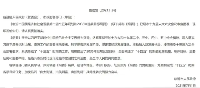 各级各部门要认真学习,深刻领会《纲要》精神,结合本地区、本部门实际,切实抓好《纲要》的贯彻落实,为顺利完成“十四五”时期各项目标任务,加快临沂“由大到强、由美到富、由新到精”战略性转变而努力奋斗。