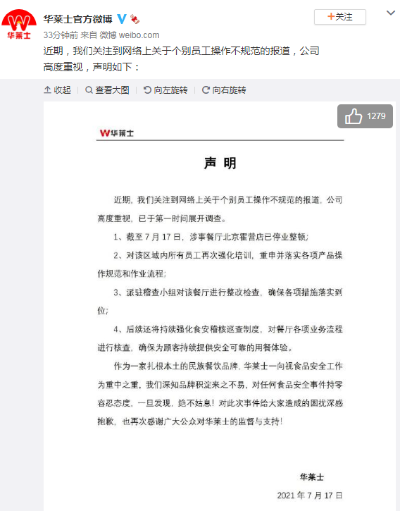 17日晚,华莱士回应称,截至7月17日,涉事餐厅北京霍营店已停业整顿,派驻稽查小组对该餐厅进行整改检查,同时对该区域内所有员工再次强化培训,重申并落实各项产品操作规范和作业流程。