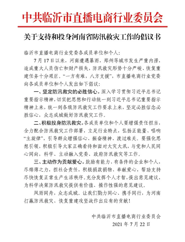 近日,河南省部分城市遭遇水灾,牵动着广大人民群众的情思。一方有难,八方支援。临沂市直播电商行业党委积极作为,继发起助力脱贫攻坚、助力乡村振兴倡议后,再次发挥桥梁纽带和引领带动作用,第一时间向广大主播下发《关于支持和投身河南省防汛救灾工作的倡议书》,倡议各成员单位和个人积极捐款捐物,伸出援助之手。