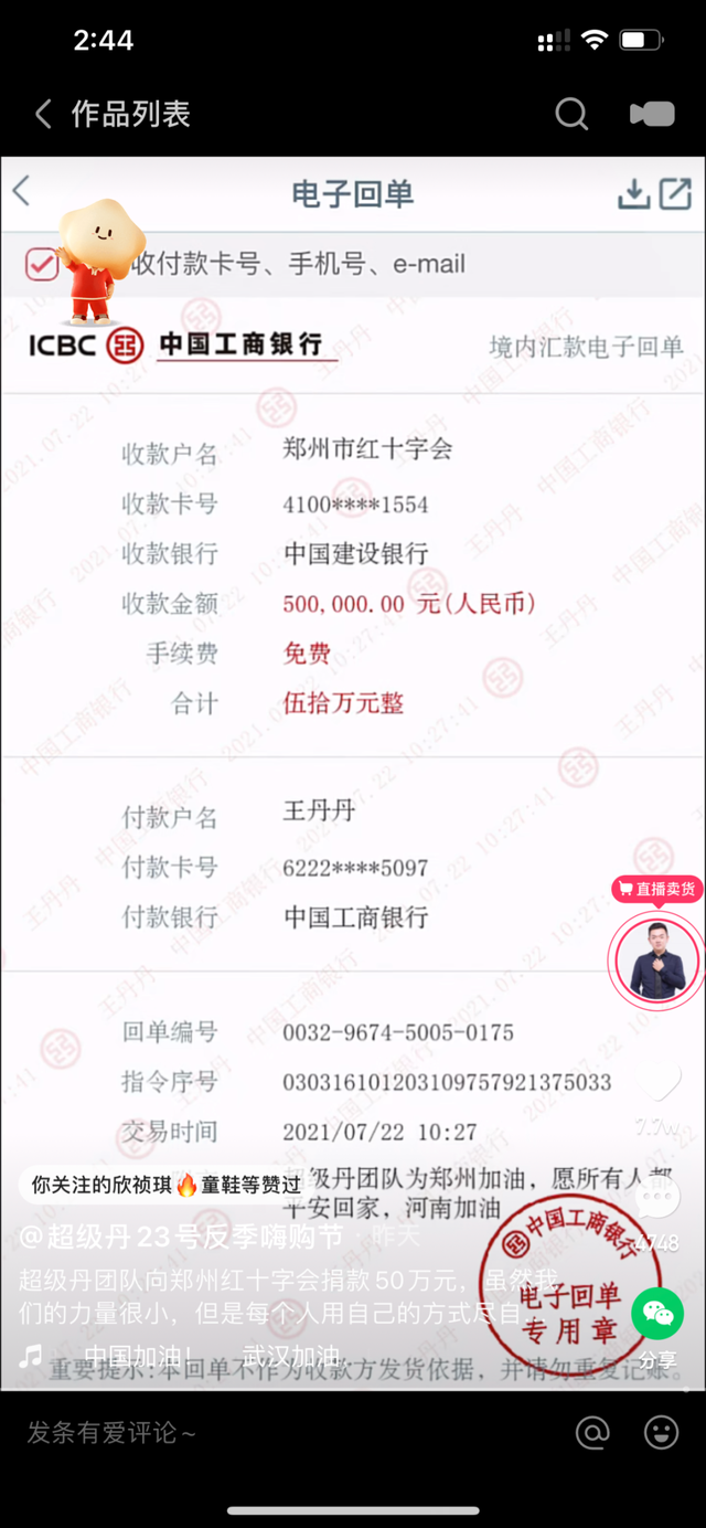收到倡议书后,直播电商行业党委各成员单位,广大主播及幕后团队,各供应链、选品链企业积极响应,踊跃捐款捐物。其中,拥有超过1000万粉丝的党员主播超级丹率先向郑州红十字会紧急捐款50万元,驰援当地抗洪救灾工作,并表示将优先与支援河南的企业和个人进行合作。