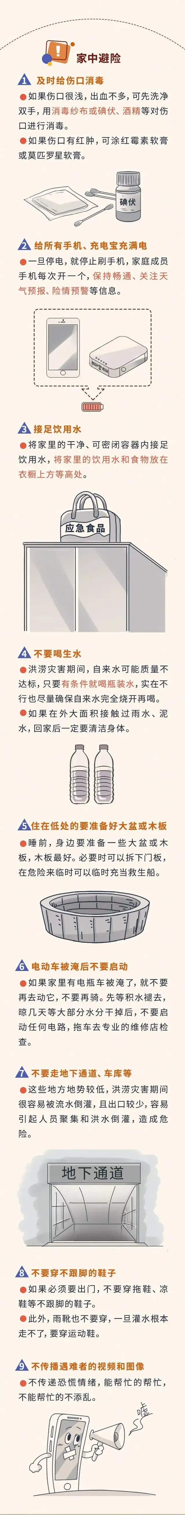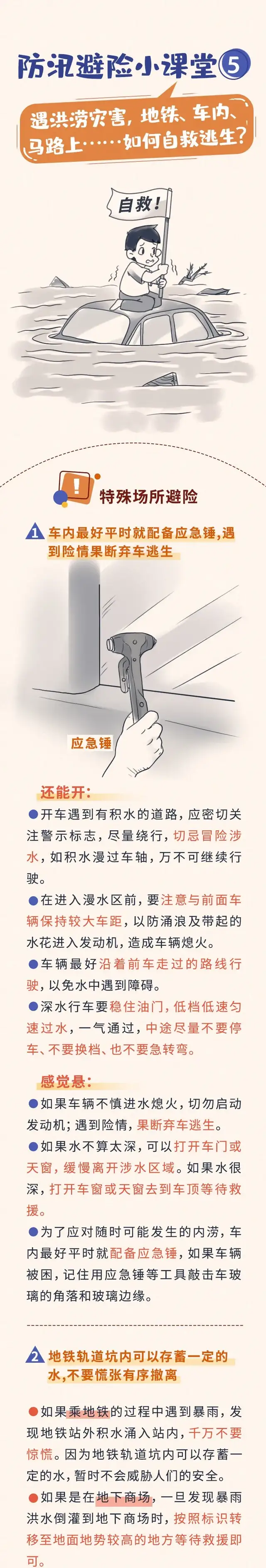“烟花”或带来强降雨、大风等天气变化,严重时会造成城市内涝。应该如何应对以上极端天气情况?遇到内涝如何自救?请看下图: