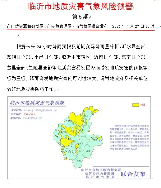 临沂市水利局和临沂市气象局7月27日联合发布临沂市山洪灾害气象预警: