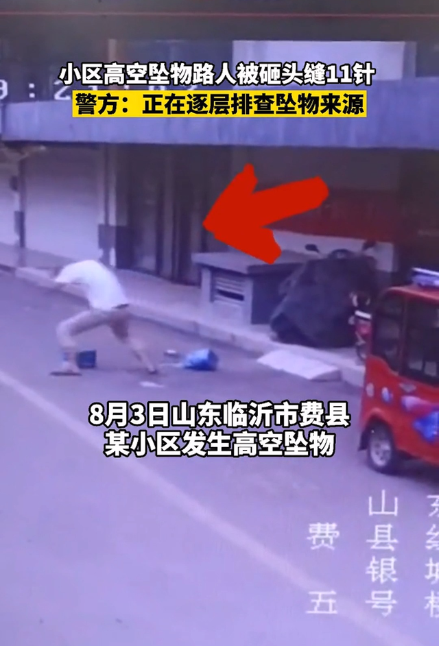 8月3日,晚上七点多钟,山东省临沂市费县某小区,男子小王出门取快递。他路过一栋商业楼时,高空突然掉下一硬物,不偏不倚地砸在小王头上,血流不止。