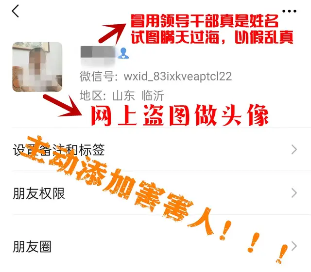 骗子常用手法是,利用互联网上领导的公开信息等途径,初步获悉所要冒充的领导干部的个人基本情况等情况,用所要冒充的领导干部的真实姓名和头像作为微信昵称和微信头像,有时候注明“政务微信”,以假乱真。
