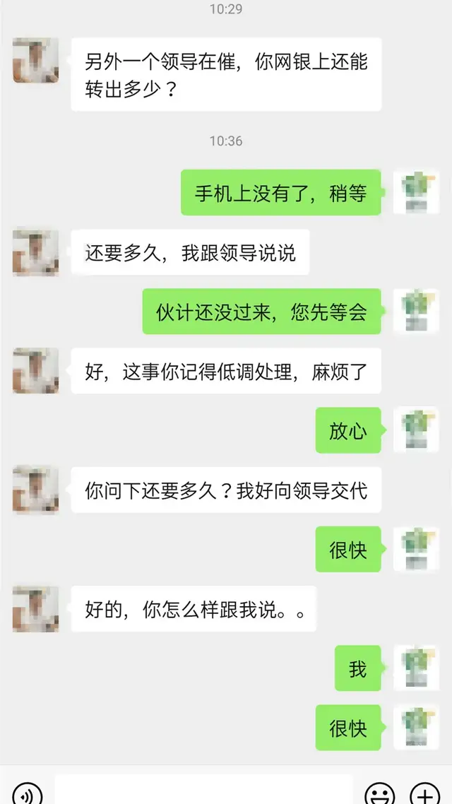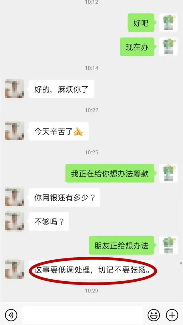 加完好友后,骗子就要开始上演重头戏了。骗子通常以自己领导干部身份不方便为由,要求受害人替他转账给别人(当然,可能也会有其他理由,总之就是要钱)。理由往往客观又可信,话语间无不流露着信任与器重,通常会带给受害人头脑发热的错觉。骗子重点提醒受害人一定要嘴严,要保密。受害人一旦被“催眠入戏”,则根本不会去分析判断真伪疑点了......