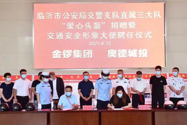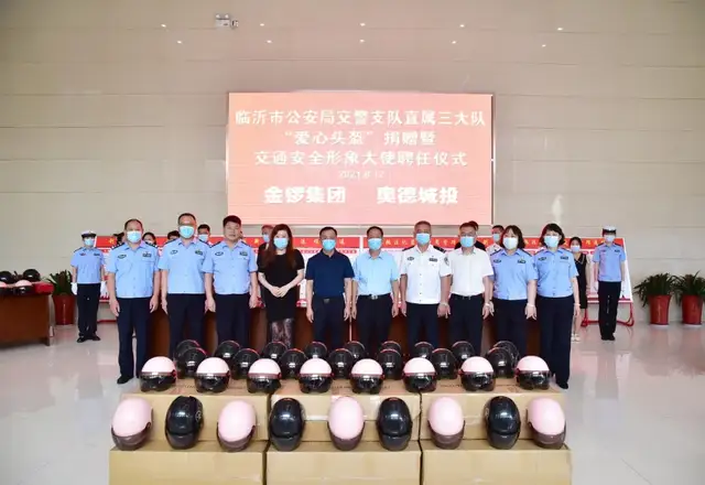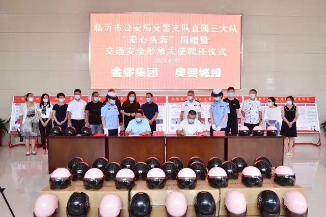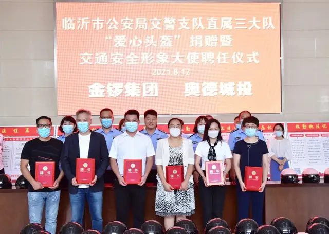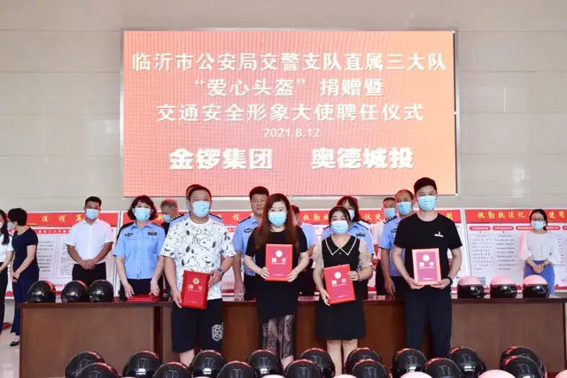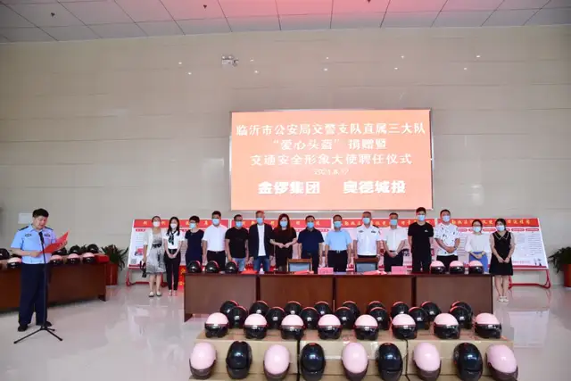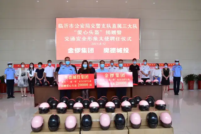 为深入推进“一盔一带”安全守护行动,8月12日上午,临沂交警支队直属三大队举行“爱心头盔”捐赠暨交通安全形象大使聘任仪式。临沂市慈善总会副会长王连正,临沂市公安局交警支队党委委员、车管所所长、二级高级警长李焱,临沂市市场监管局四级调研员冯波,临沂市慈善总会综合项目募捐部部长赵慧,临沂新程金锣肉制品集团有限公司党委书记郑培清,山东奥德城投开发有限公司总经理林雨静以及10名交通安全形象大使出席仪式。直属三大队班子成员及部分民警辅警代表参加活动。