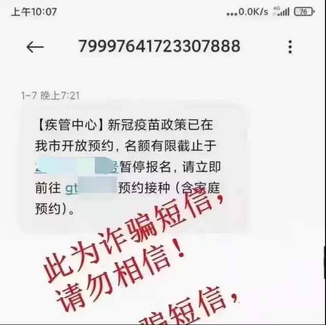 这是一种将诈骗短信包装成防疫提示的骗局,以往有预约疫苗接种的内容,现在又出现了3小时做核酸、意外保障到达等借口,不管如何包装,根本就是发送含有“钓鱼网站”链接的短信,诱导点击链接。此类群发短信诈骗,除了获取公民个人信息,也是针对受害人的“海选”。
