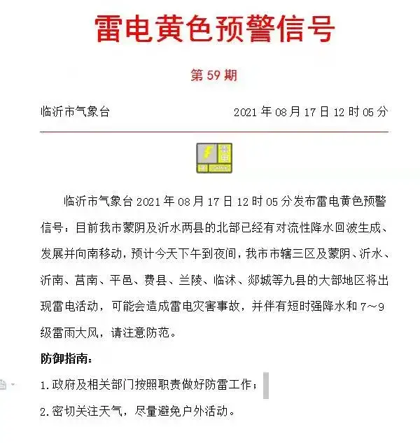临沂市气象台2021年08月17日12时05分发布雷电黄色预警信号:目前我市蒙阴及沂水两县的北部已经有对流性降水回波生成、发展并向南移动,预计今天下午到夜间,我市市辖三区及蒙阴、沂水、沂南、莒南、平邑、费县、兰陵、临沭、郯城等九县的大部地区将出现雷电活动,可能会造成雷电灾害事故,并伴有短时强降水和7~9级雷雨大风,请注意防范。