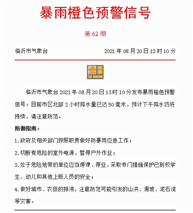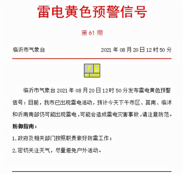 临沂市气象台2021年08月20日12时50分发布雷电黄色预警信号:目前,我市已出现雷电活动,预计今天下午市区、莒南、临沭和沂南南部仍可能出现雷电,可能会造成雷电灾害事故,请注意防范。