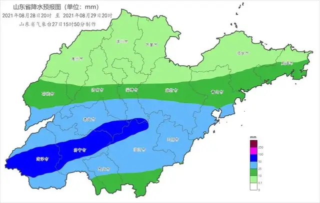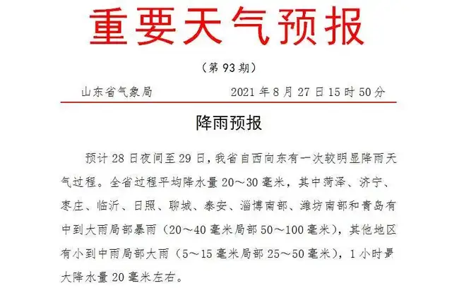 预计28日夜间至29日,山东自西向东有一次较明显降雨天气过程。全省过程平均降水量20~30毫米,其中菏泽、济宁、枣庄、临沂、日照、聊城、泰安、淄博南部、潍坊南部和青岛有中到大雨局部暴雨(20~40毫米局部50~100毫米),其他地区有小到中雨局部大雨(5~15毫米局部25~50毫米),1小时最大降水量20毫米左右。