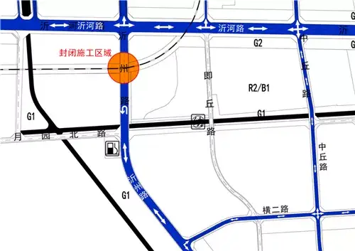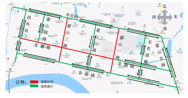 蒙山一路、蒙山三路与永安路、金源路交汇处施工时,封闭蒙山一路、蒙山三路路口,不影响永安路、金源路东西向行驶。